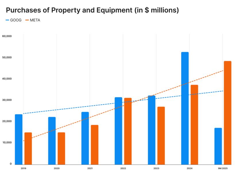 Meta’s relative underperformance in the bottom line can be predominantly attributable to increasing expenditure in compute infrastructure: at $48.3 billion so far this year, purchases of property and equipment were 216% that in the same period in the same period in the previous FY. Meanwhile, Google’s purchases of plant and property is 166% that in the same period in the previous FY.