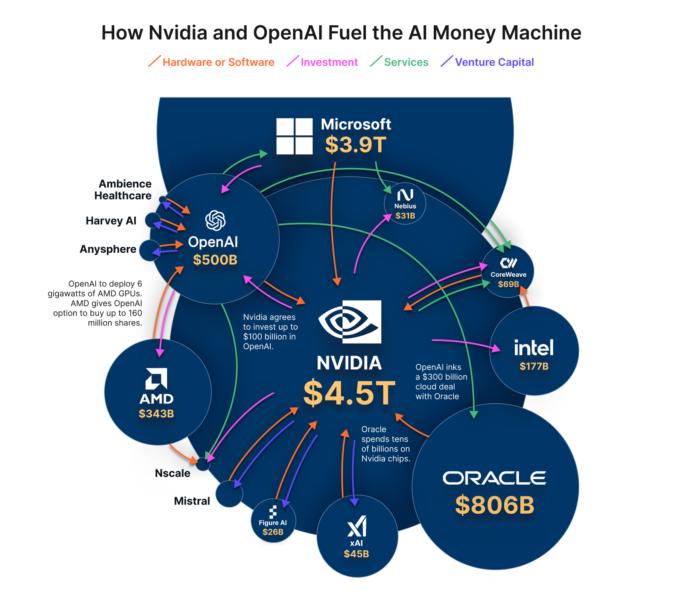 This long-running notion has led to the creation of a massive network of "circular deals"2 worth several trillions of dollars predominantly around Nvidia and OpenAI – which typically sees a pattern of purchases of products and services following an investment. This serial money machine is now nearly-inextricably linked to every major American tech firm and leading AI startup.
