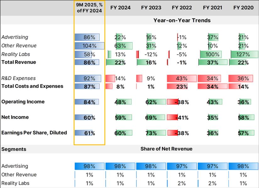 If trends over 9M 2025 continue, total revenue will be around 15% higher than that in FY 2024 but earnings per share will be around 19% lower. Revenues from advertising remains, by far, the biggest source of revenues with both "Other Revenue" – representing its WhatsApp Business platform, Meta Verified subscriptions and developer fees – and "Reality Labs" – representing its VR headsets and glasses – being relatively insignificant and consistently under 2% since FY 2020.