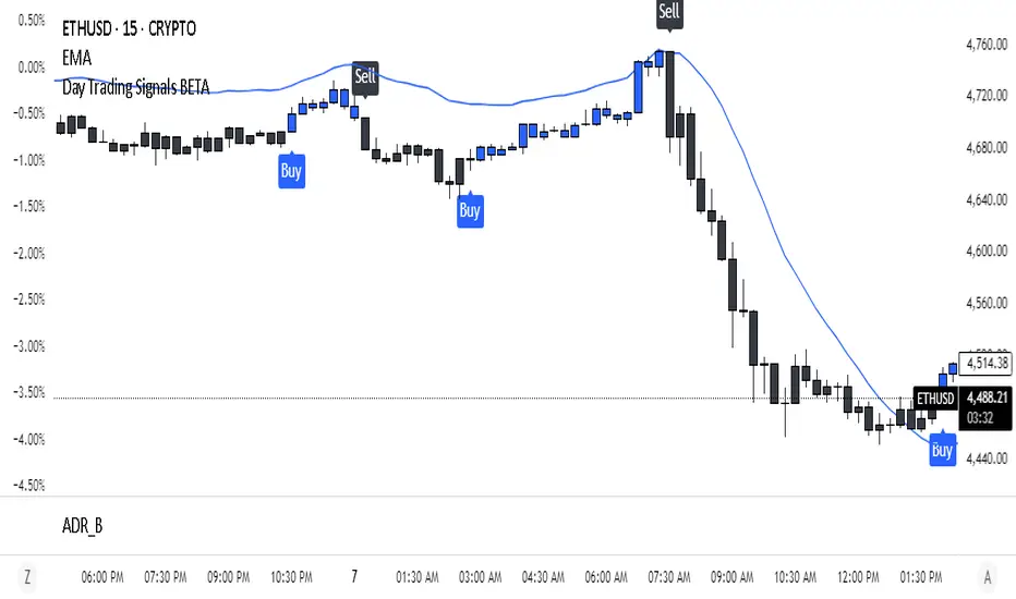 This TradingView indicator, titled "Day Trading Signals BETA," is a trend-following tool designed to generate clear buy and sell signals directly on the price chart. Its core logic is built around an ATR (Average True Range) trailing stop, which dynamically calculates a stop-loss level that adjusts based on market volatility. The script plots a "Buy" signal when the price crosses above this trailing stop, indicating a potential shift to an uptrend, and a "Sell" signal when the price crosses below it, signaling a potential move into a downtrend. The indicator also colors the price bars blue for bullish conditions and black for bearish conditions, providing an immediate visual confirmation of the current market trend. User-adjustable inputs for sensitivity (Key Value) and the ATR Period allow traders to customize the indicator's responsiveness to different assets and timeframes.