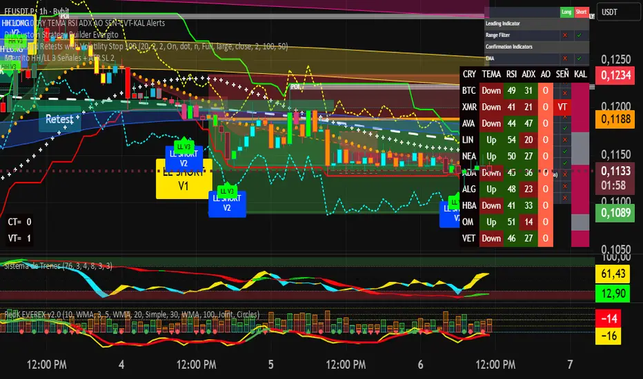 Practical example: You see a large green label “HH LONG V1” → you go long at the close of that candle. Stop right at the blue line (ATR x2 below the price).