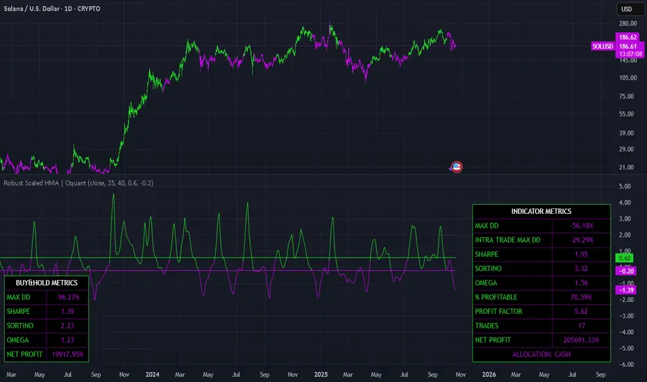 The Robust Scaled HMA is an indicator designed to provide a more resilient trend-following signal by combining the Hull Moving Average (HMA) with a robust scaling mechanism based on interquartile range (IQR). Unlike traditional scaled indicators that rely on standard deviation, which can be skewed by outliers in volatile markets, this approach uses quartiles to normalize the HMA values, offering better resistance to extreme price movements. It generates long and short signals based on user-defined thresholds and includes built-in performance metrics to evaluate the indicator's historical behavior, alongside buy-and-hold comparisons(Remember past performance doesn’t guarantee future results). This allows traders to assess potential effectiveness without needing external backtesting tools(Remember past performance doesn’t guarantee future results). The indicator is particularly useful for those seeking a balance between responsiveness and robustness in trend detection, and it visualizes allocation states (LONG, SHORT, or CASH) through color-coded plots and optional tables.