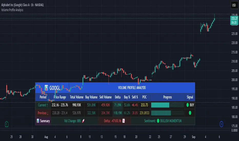 The Volume Profile Dashboard is a professional-grade analysis tool built for TradingView. It focuses on displaying a comprehensive volume profile breakdown within a dashboard format directly on the chart. The purpose of this tool is to help traders quickly assess buy versus sell volume dynamics, momentum, and sentiment in order to support informed trading decisions.
