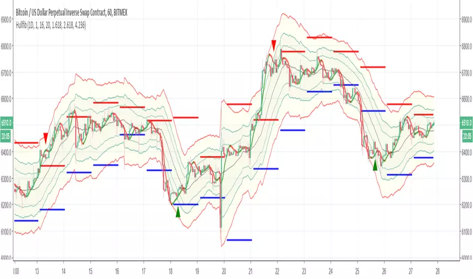 it based on Bollinger type of fibs with regular daily fibs (upper =red,lower= blue) and the signal produce by the Hull moving average