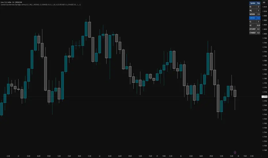 Never second-guess your position size again. This indicator displays your pre-configured contract or lot sizes for all your frequently traded instruments, so you always know exactly how much to trade the moment you open a chart.