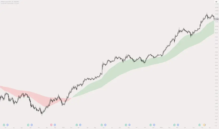 This indicator plots two customizable moving averages and highlights the ribbon (area) between them to help visualize trend direction, momentum, and market structure at a glance.