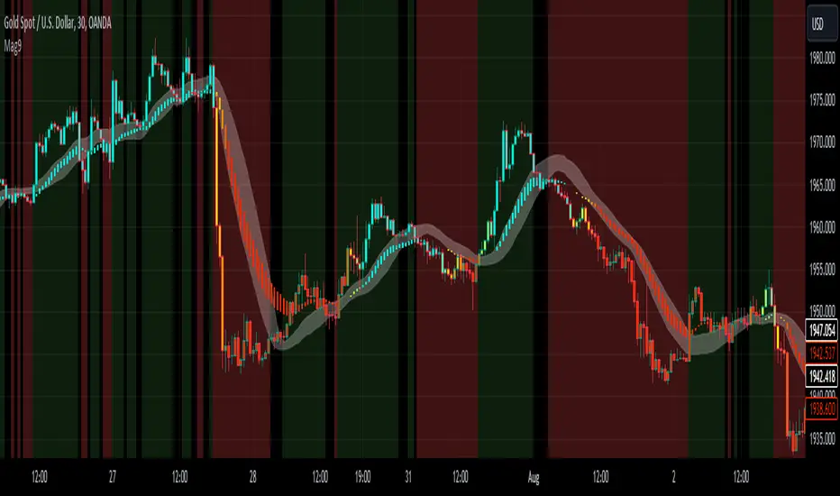 Mag9 represents the enhanced iteration of Scaler. The sole rule governing buying and selling in this script is as follows: initiate a buy when sky blue bars beneath the candles begin forming within the white cloud, and execute a sell when these bars, colored red, commence forming within the white cloud.
