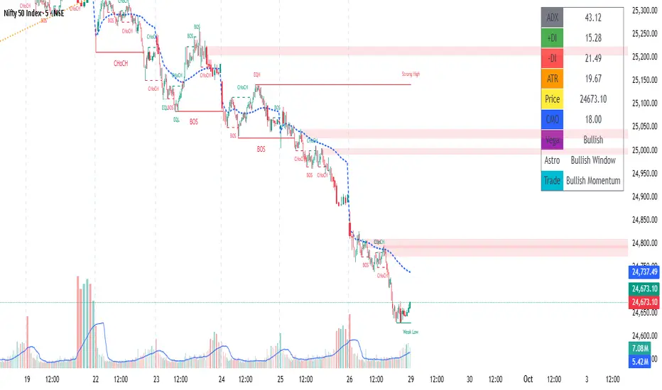 This indicator is designed for professional scalpers and intraday traders who want to capture only strong momentum waves — not noise. It combines trend strength, volatility, directional movement, momentum oscillation, vega divergence, and astrological timing into a single compact table on your chart.