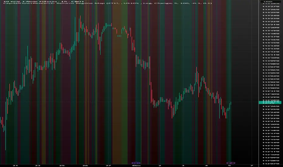 CapitalFlowsResearch: Returns Regime Map is a two-asset regime overlay that shows how a primary market and a linked macro series are really moving together over short rolling windows. Instead of just eyeballing two separate charts, the tool classifies each bar into one of four states based on the combined direction of recent returns: