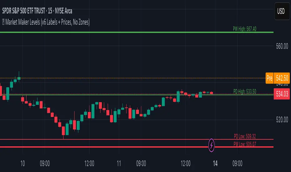Market Maker Levels is a powerful indicator designed to highlight the key price levels where institutional activity often leaves its mark. By plotting the previous week's and previous day's highs and lows, this tool provides traders with clear visual references for significant support and resistance zones.
