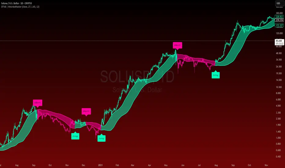 Double Trisectional Volatility Bands (DTVB) is a volatility-based trend indicator designed to create smooth yet adaptive price envelopes capable of tracking trend structure while reacting to volatility expansion. The indicator emphasizes stability during consolidation while clearly highlighting strong price moves beyond normal market behavior.