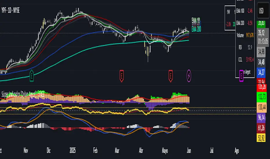 Este indicador combina múltiples herramientas de análisis técnico en una única solución avanzada, diseñada para traders que requieren una visión holística del mercado. Integra 7 medias móviles personalizables, análisis de volumen, indicadores técnicos y tablas de rendimiento para evaluar la evolución del activo en diferentes horizontes temporales.