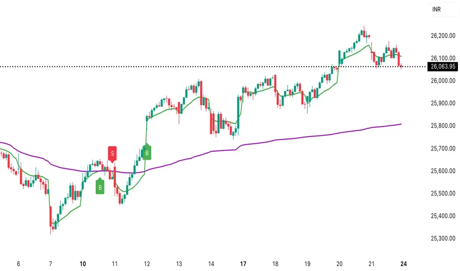 Visual Crossovers: Clearly marked "B" (Buy) and "S" (Sell) labels on the chart.