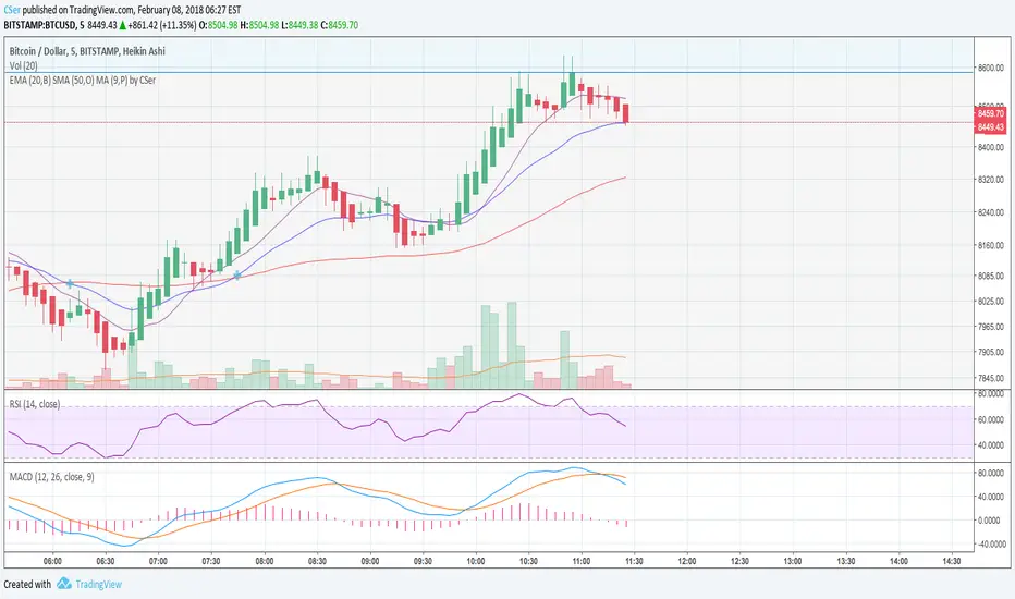 Combination of EMA (20), SMA (50) and the default MA (9) with the addition of crosses for EMA and SMA for quick decisions. Let me know your thoughts, corrections and/or additions.