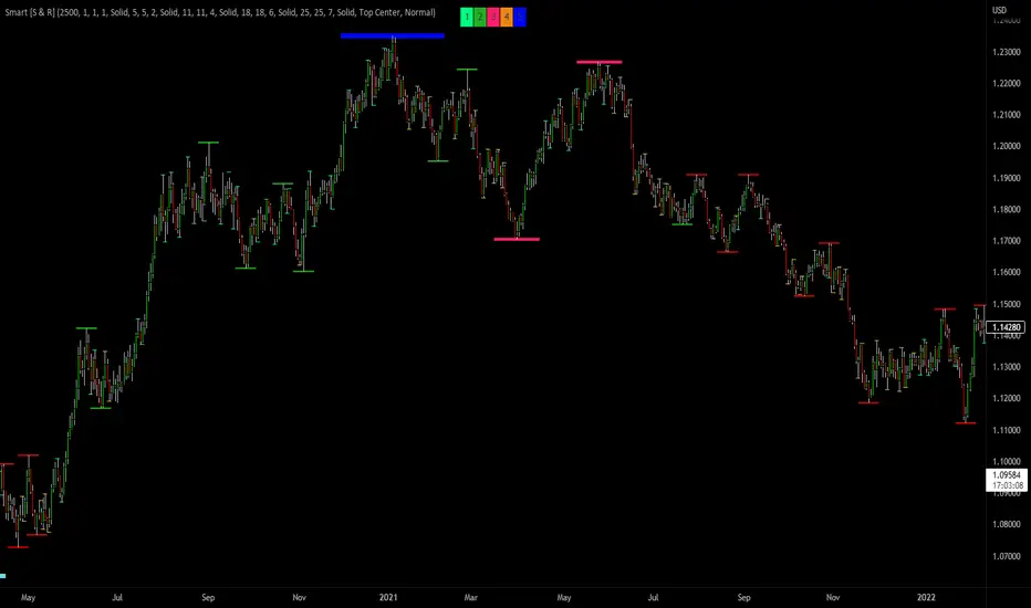 - You have the option to customize the Length, Width, Line Style, and Colors of all 5 different [S&R Levels.]