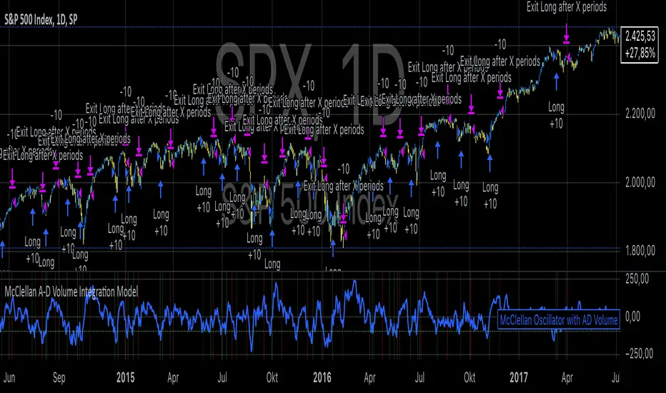 The strategy integrates the McClellan A-D Oscillator with an adjustment based on the Advance/Decline (A-D) volume data. The McClellan Oscillator is calculated by taking the difference between the short-term and long-term exponential moving averages (EMAs) of the A-D line. This strategy introduces an enhancement where the A-D volume (the difference between the advancing and declining volume) is factored in to adjust the oscillator value.