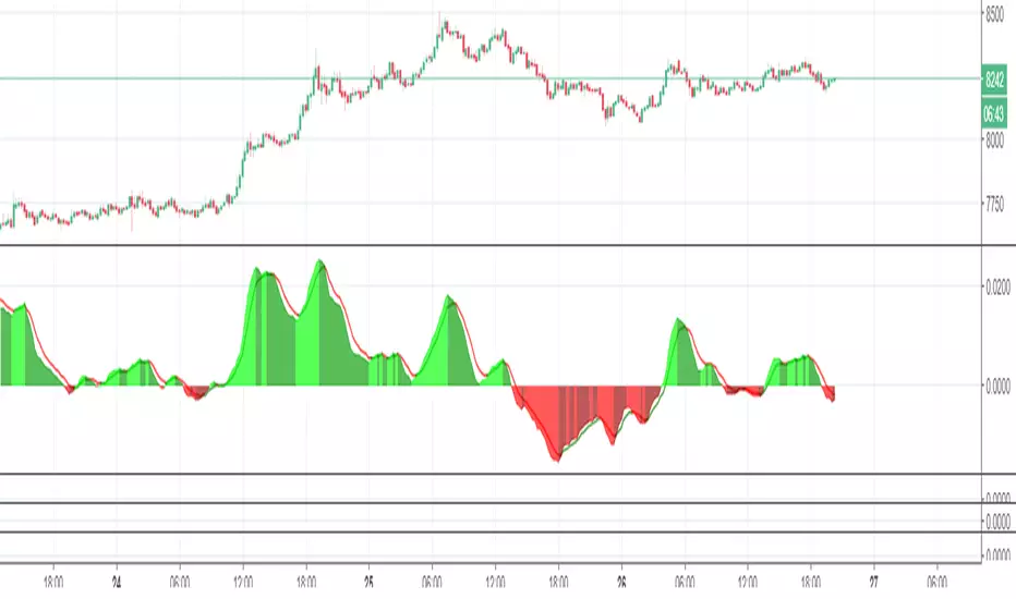 Based on the usual Elliot Wave Oscillator but divided by price so it scales with history better, added the 4 colours and a signal line.