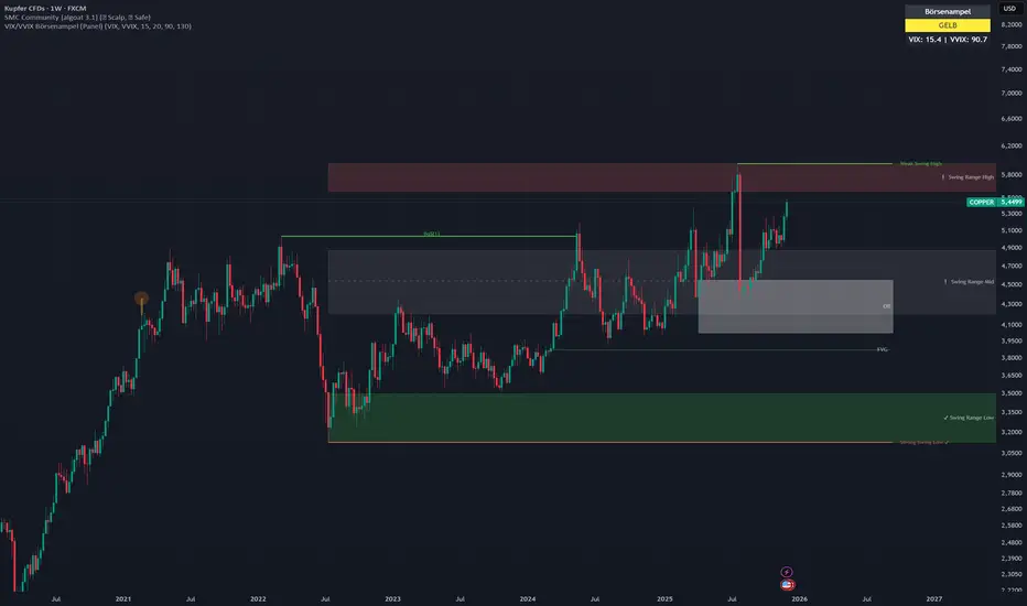 The “VIX/VVIX Traffic Light (Panel)” visualizes the current market risk as a simple traffic light (green / yellow / red) in the top‑right corner of the chart, based on the VIX and VVIX indices.