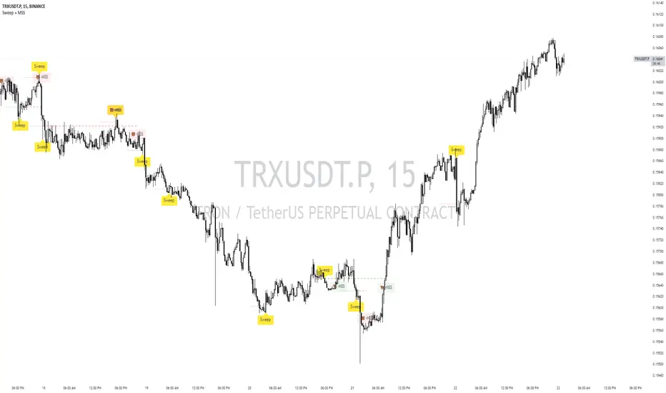 This indicator identifies market sweeps and Market Structure Shifts (MSS) to help traders recognize potential trend changes and market manipulations.