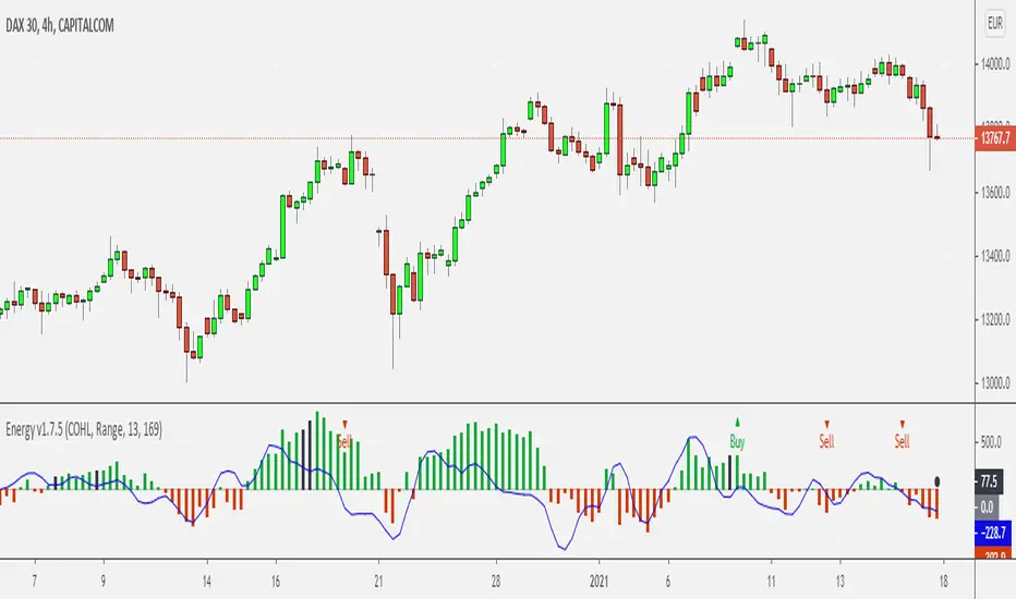This script measures cumulative 'Energy' in a security built up over time where bulls add to the cumulative energy and bears reduce it. Changes to this cumulative energy result from the battle between bulls and bears and can give indications on major turning points as well as signals as to when to enter into a long or short trade. This indicator must be used in conjunction with other techniques.OUTPUTS: