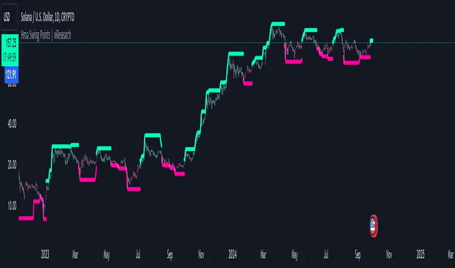 The "Hma Swing Points" script is useful for traders who aim to identify critical market turning points and potential reversals. It is especially effective in trending markets where price swings present trading opportunities. Traders can use the script to detect reversals by spotting swing points that indicate a possible shift from bullish to bearish trends, or vice versa. The script also helps confirm ongoing trends by showing the strength of swings, allowing traders to make informed decisions about entering or exiting trades. Its ability to mark precise swing points enhances trade timing, helping traders optimize their entries and exits.