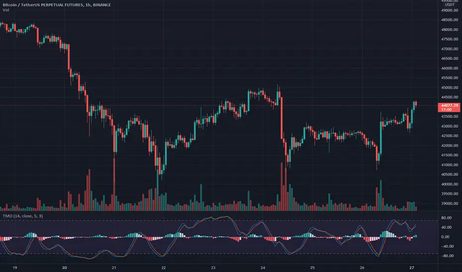 Similarly to MACD it has a TMO line and a signal line. The histogram shows the difference between those lines and easily lets you spot crossovers.
