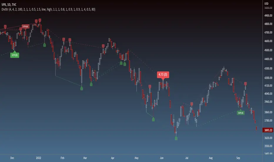 (3) Fully customizable, including inputs for pivot lengths, divergence types, and weights for every component of the divergence strength calculation. This allows you to quickly and easily optimize the output for any chart. Don't worry, the default settings will have you covered if you're not interested in what's going on under the hood.