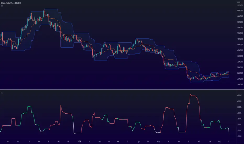 If we take the difference between Donchian Channels upper and lower, we can get a lot of information on the trend. I made it into a percentage and used a color system to make it easy to look at.