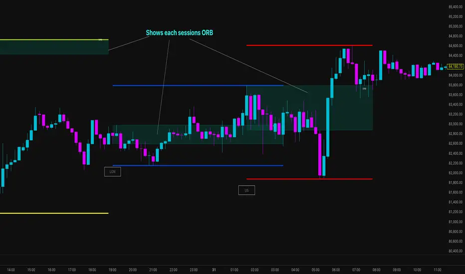 This script combines multi-session range visualization with per-session ORB levels in one tool, which can help assess where liquidity pools may exist and where price could be drawn to fill or sweep certain areas.Best used on lower timeframes (e.g., 1m–15m) for intraday analysis. Session times are fixed (no automatic DST handling); users can modify them in the code if needed.Not financial advice. Trading involves significant risk of loss. Use at your own discretion and always test thoroughly.