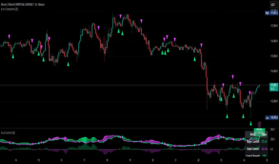 This companion indicator displays crossover signals directly on the price chart based on the same buyer vs seller control calculations. It identifies moments when the relationship between buying and selling pressure shifts by analyzing where prices close relative to their intraday ranges.