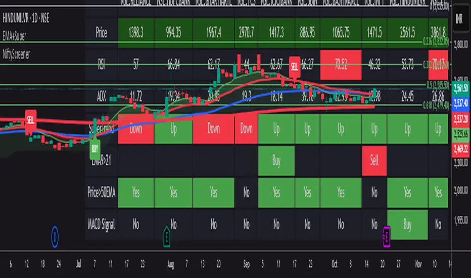 Nifty 50 stock screener that displays real-time technical signals for the top 10 weighted stocks. It shows key indicators like RSI, ADX, SuperTrend, EMA crossovers, price position, and MACD signals in a tabular format on the chart. Users can customize stock visibility, display position, and text size, making it a handy tool for quick, multi-indicator analysis of Indian blue-chip stocks. Perfect for intraday and swing trading, it helps identify trend strength, momentum shifts, and buy or sell signals efficiently.