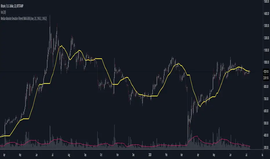 Once we have a cutoff range an SMA is calculated with the outliers filtered out. Additionally a Bollinger band can be output using the filtered SMA as the basis and a multiple of the MAD instead of SD for the bands.