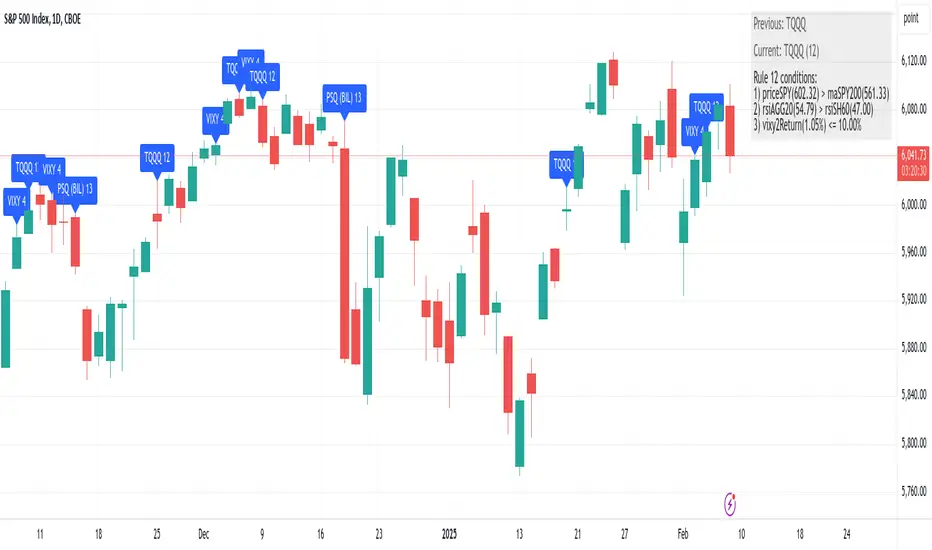 This strategy dynamically selects an asset to trade each day based on a set of predefined market conditions and technical indicators. It uses relative strength index (RSI) and moving averages to evaluate momentum and trends across multiple tickers, aiming to identify the most advantageous asset for the current market environment. By switching between leveraged ETFs, inverse funds, and defensive assets, the strategy seeks to capitalize on both bullish and bearish scenarios while mitigating risk during uncertain periods.