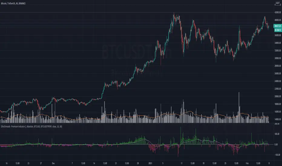 The indicator is used to show the difference between the futures and spot asset price on cryptocurrencies like BINANCE:BTCUSDTPERP and BINANCE:BTCUSDT