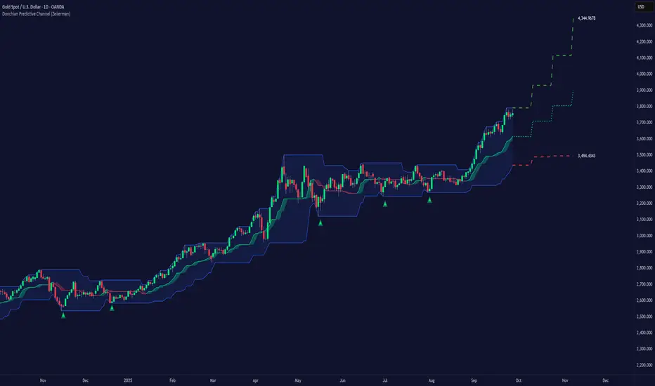 Donchian Predictive Channel (Zeiierman) extends the classic Donchian framework into a predictive structure. It does not just track where the range has been; it projects where the Donchian mid, high, and low boundaries are statistically likely to move based on recent directional bias and volatility regime.