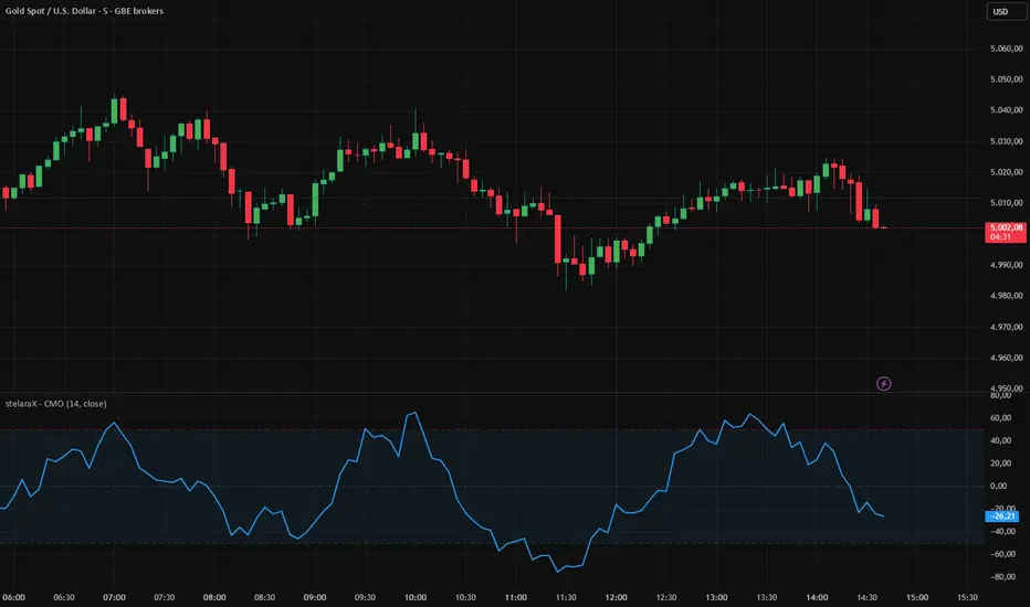 stelaraX – Chande Momentum Oscillator (CMO) is a momentum oscillator designed to measure the strength and direction of price movement by comparing recent gains and losses. It reacts faster than many traditional oscillators and provides clear insight into momentum extremes and shifts.