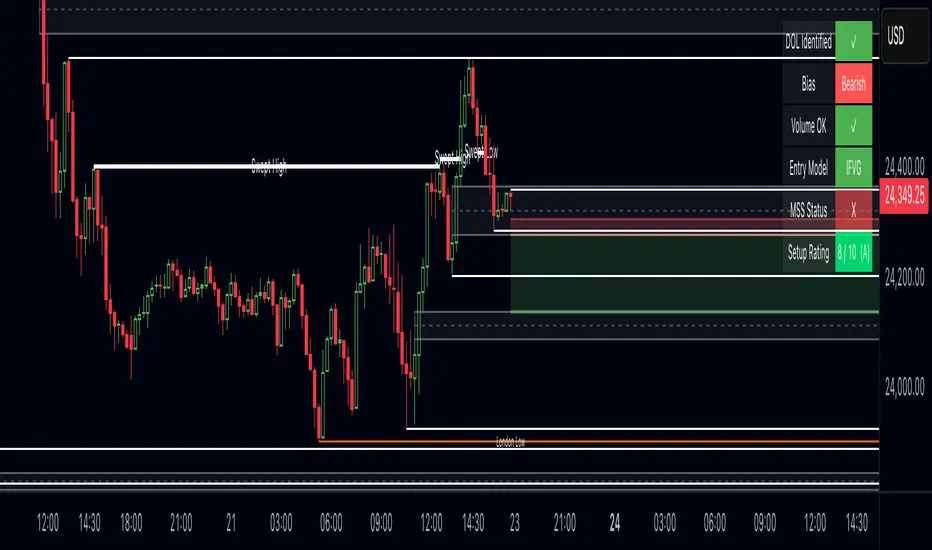 This indicator automates Blastoise's 85% Win-Rate Trading Strategy, built around high-probability intraday setups on NQ and ES using Draw on Liquidity (DOL), Market Structure Shifts (MSS), and Fair Value Gaps (FVG)