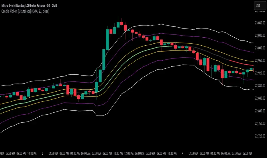 The Candle Ribbon is created using a series of three moving averages that uses values from the candle as its inputs. The user has the ability to select whether the moving averages are EMAs or SMAs, as well as the ability to control the period of the moving averages.