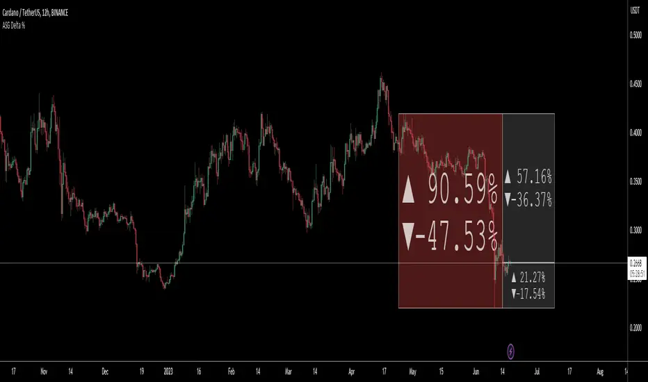 Simply select the desired date range, and the script will identify the highest and lowest price points achieved during that period. It then shows a visual representation in the form of a bullish or bearish box, displaying the percentage change (delta %). If the current price falls within the box's upper and lower bounds, additional percentage information can be shown in either the 'normal' or 'reverse' mode.