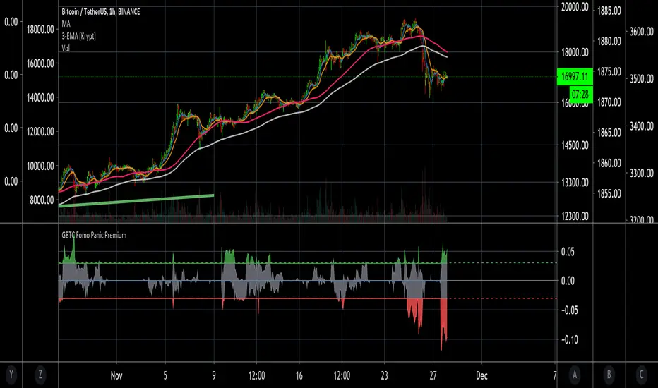 It is rumored that GBTC price action leads the Bitcoin market. This indicator compares GBTC fomo/panic levels to the (Binance) BTC spot market. Fomo is measured as large percentage moves of the high price from the min over a look-back period. Panic is measured as large percentage moves of the low price from the max over a look-back period. A prime example of this indicator's usage would be as a sell signal confirmation during the 2020 pre-Thanksgiving panic exhibited on the 1-hour chart while the 20 EMA was still above the 99 SMA.