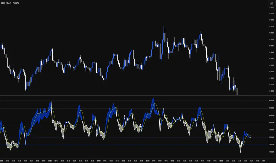 A gradient highlights the relationship between the two RSIs, useful for spotting divergences or trend exhaustion.