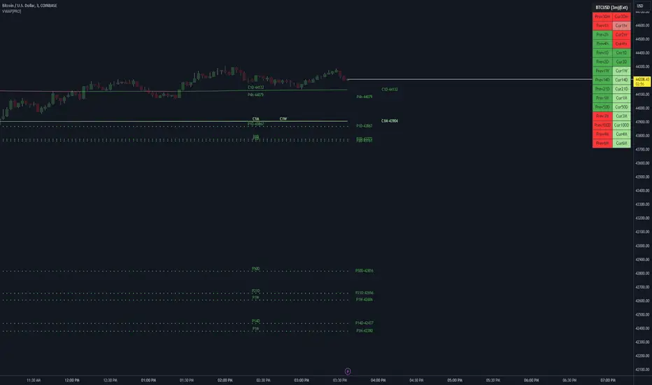 32 VWAP levels with labels and a table to help you identify quickly where current price is in relation to your favorite VWAP pivot levels. To help reduce cognitive load, 4 colors are used to show you where price is in relation to a VWAP level as well as the strength of that respective level. Ultimately, VWAP can be an invaluable source of support and resistance; in other words you'll often see price bounce off of a level (whether price is increasing or decreasing) once or multiple times and that could be an indication of a price's direction. Another way that you could utilize this indicator is to use it in confluence with other popular signals, such as an EMA crossover. Many traders will wait till a bar's close on the 5m or 10m time frame above a VWAP level (developing 1D VWAP would be a popular choice) before making a decision on a potential trade especially if price is rising above the 1D VWAP *and* there's been a recent 100 EMA cross UP of the 200 EMA. These are 2 bullish signals that you could look for before possibly entering in to a trade.