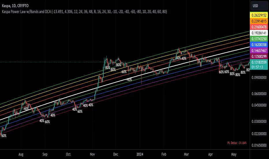 Simple Power Law Indicator for Kaspa with addition of adjustable bands above and below the Power Law Price. Best used on Logarithmic view on Daily Time Frame.