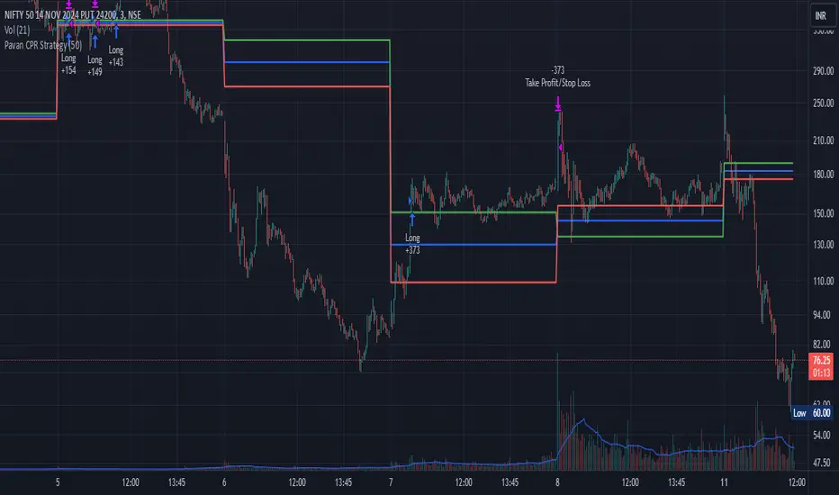 Pavan CPR Strategy (Pine Script)The Pavan CPR Strategy is a trading system based on the Central Pivot Range (CPR), designed to identify price breakouts and generate long trade signals. This strategy uses key CPR levels (Pivot, Top CPR, and Bottom CPR) calculated from the daily high, low, and close to inform trade decisions. Here's an overview of how the strategy works: