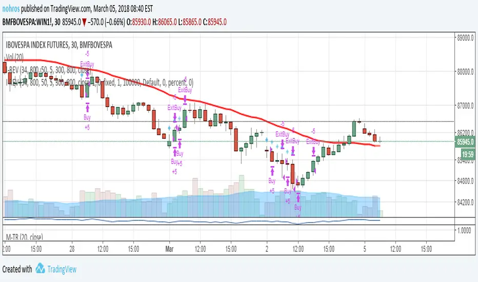 A mean reversion trade is a type of trade that looks for price that has moved away significantly from its mean (average) price. Every stock has its unique combination of parameters that best fit the mean reversion, the default parameters of this script is the best fit for the WIN1! (IBOV Mini Future) when used on the 30m timeframe