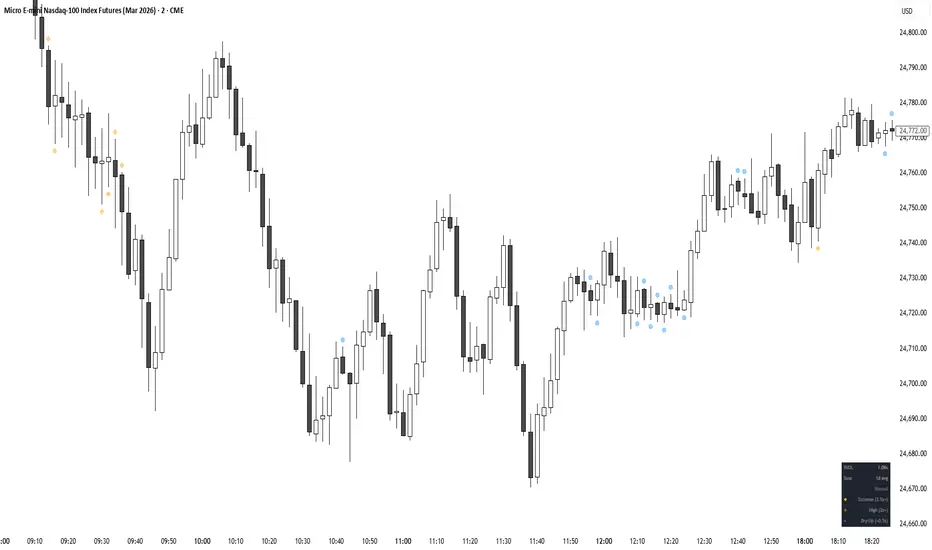 - Marks high and extreme RVOL bars with small diamond shapes. Candles stay untouched.