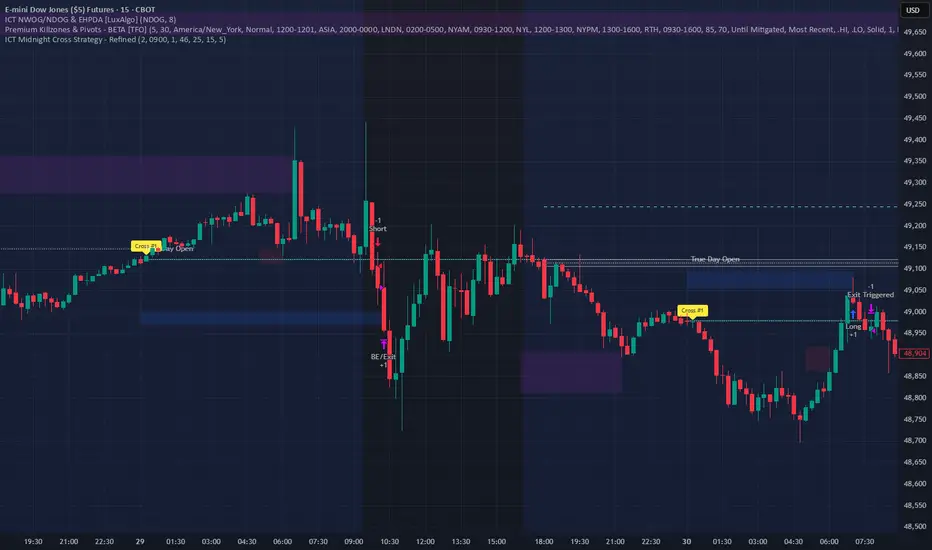 Choose the number of times price crosses over the midnight price before taking a position or use it to create alerts for crossing the midnight price. Adjust your timeframe for exiting the position. You can confirm momentum with consecutive candle closes and you can add a trailing stop or a break even profit strategy. No signals generated from this script should be considered advice for investment or trading. Created with Gemini.