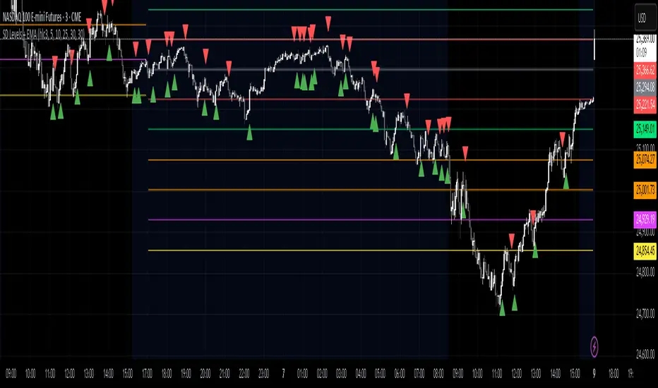The SD Levels + EMA indicator combines volatility-based standard deviation levels with dual EMA signals to help traders identify potential breakout zones, overextended regions, and trend shifts. It overlays key market structure levels directly on the chart, giving a clear visual roadmap of intraday and daily strength zones.