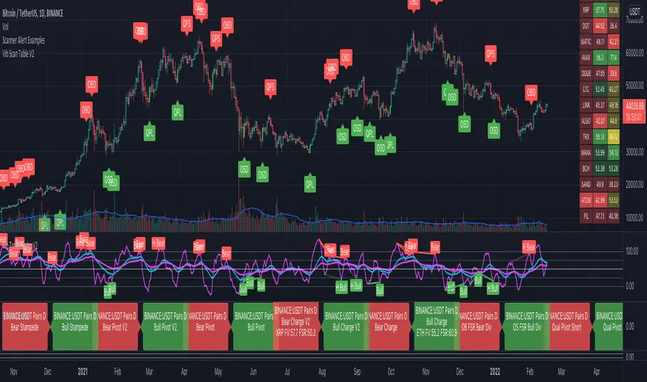 Vib Scanner Labels (bottom most panel) is an alternate option for the Vib Scanner Table (seen on right side of main chart area). Instead of a table that only sends alerts on bar close, this will print labels identifying any asset that is meeting the chosen alert criteria IN REAL TIME, though the alerts will still only trigger on bar close. It can be useful if you want to get an early eye on assets that may trigger an alert in the very near future.