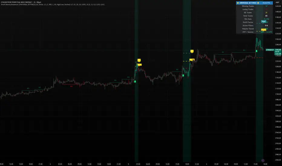 Smart Money Breakouts is a structure-driven breakout system built around BOS / CHoCH detection, higher-timeframe bias filters, and entry-centric risk management.